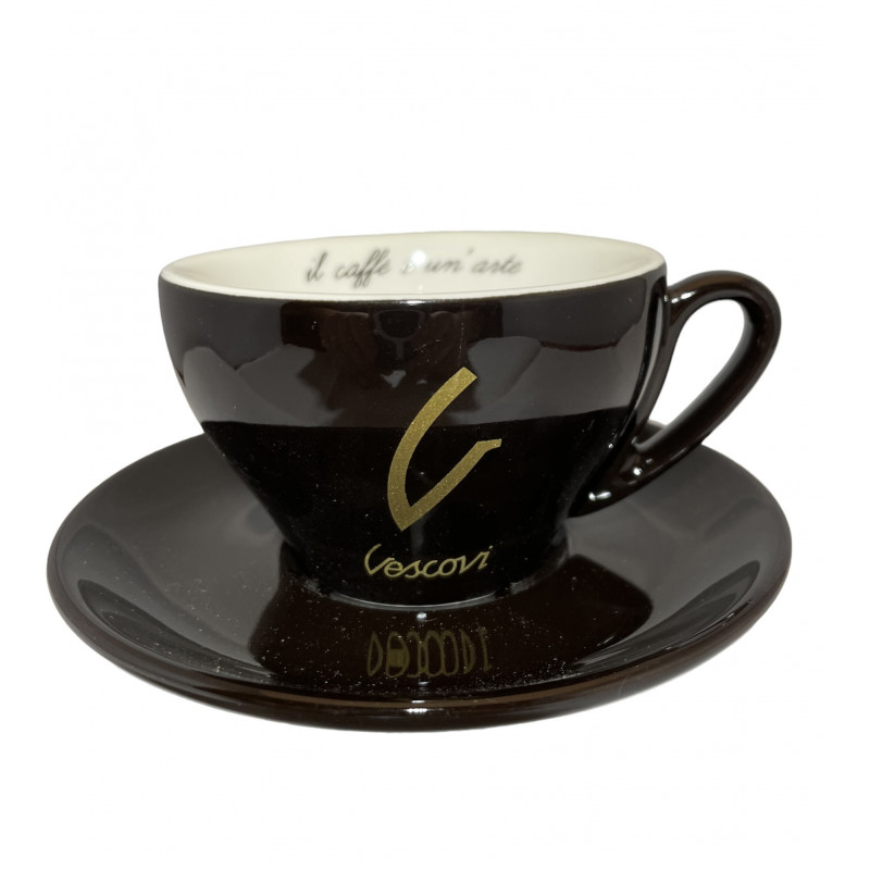 Tmavě hnědý šálek ze silnostěnného porcelánu, pro udržení teploty kávy. Speciální edice Marrone, určená k vlajkové směsi společnosti Vescovi, kávě Grani d'Oro 100% Arabica.
