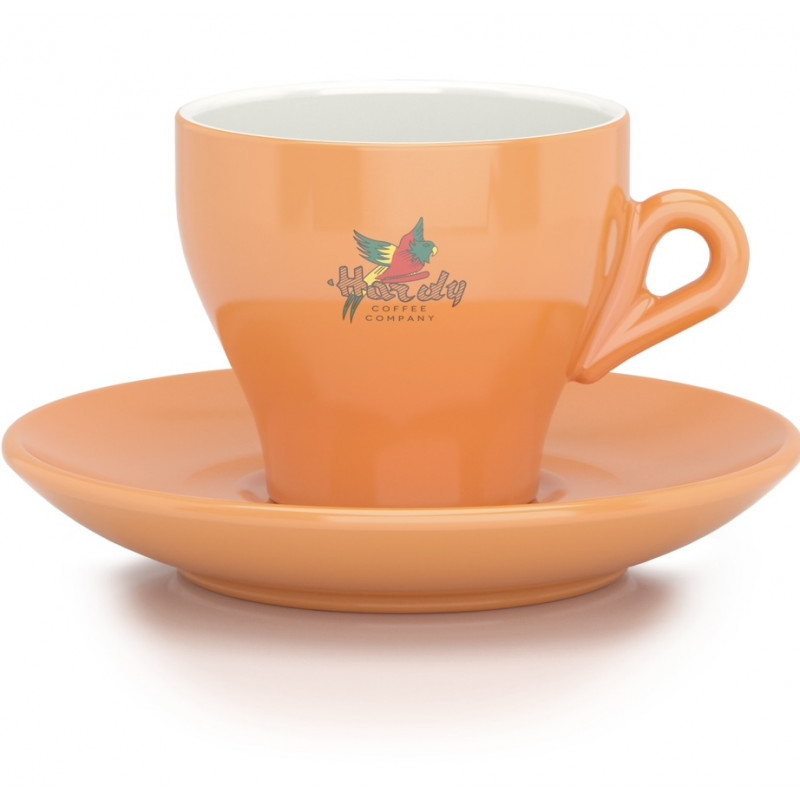 Oranžový šálek ze silnostěnného porcelánu, pro udržení teploty kávy.